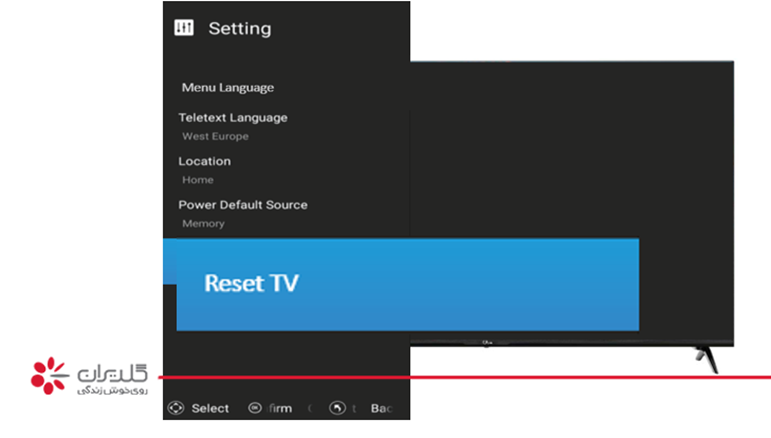 - ورود به منو و تنظیمات و انتخاب گزینهی بازنشانی تلویزیون