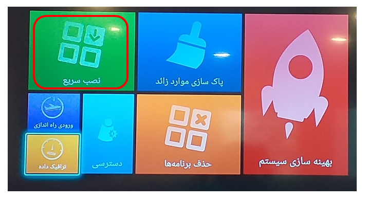 با انتخاب کلید Home، از سمت راست صفحه وارد قسمت «مدیریت تلویزیون» شوید و از بخش «نصب سریع» برنامهی مورد نظر را نصب کنید. در این بخش شما دیگر باقی محتوای فلش را مشاهده نمیکنید، بنابراین میتوانید سریعتر اپلیکیشن را بیابید.