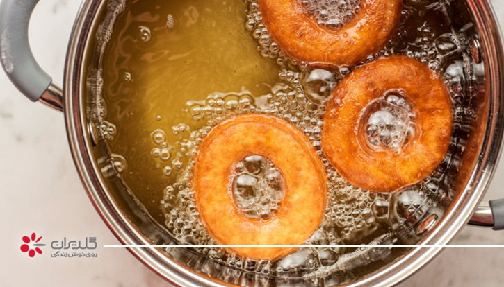 در یک ظرف به میزانی روغن بریزید که وقتی دوناتها را در آن قرار میدهید، در روغن شناور باقی بماند و ظرف روغن را بر روی حرارت ملایم قرار دهید تا روغن کاملا داغ شود.