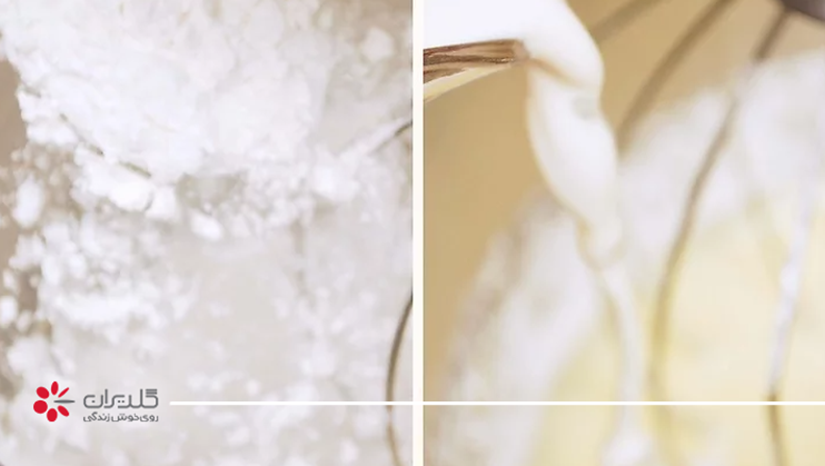 در مرحلهی بعد شیر ولرم را به خمیرمایه اضافه کنید و پس از آن آرد را دو بار الک کنید و پس از اینکه به آن مقداری نمک افزودید، 4 پیمانه آرد را کم کم به مواد اضافه کنید و مخلوط کنید.