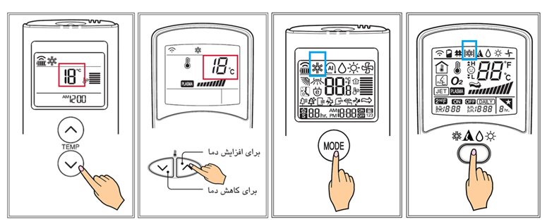 - با کلید MODE وضعیت کولر را بر روی شکل دانهی برف (سرمایش) قرار دهید.