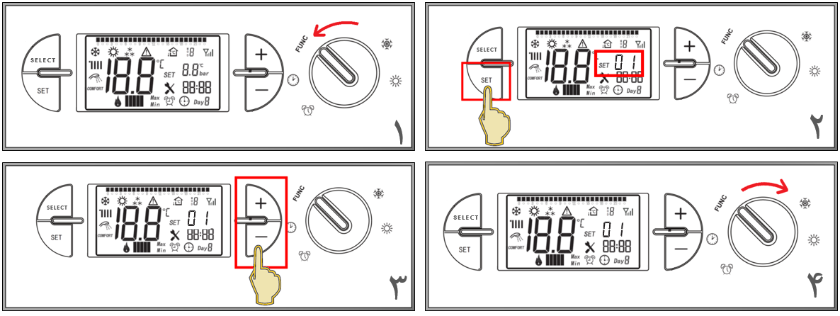 سپس با کلید set که سمت چپ پنل پکیج شوفاژ دیواری قرار دارد حالت SET01 را انتخاب کنید.